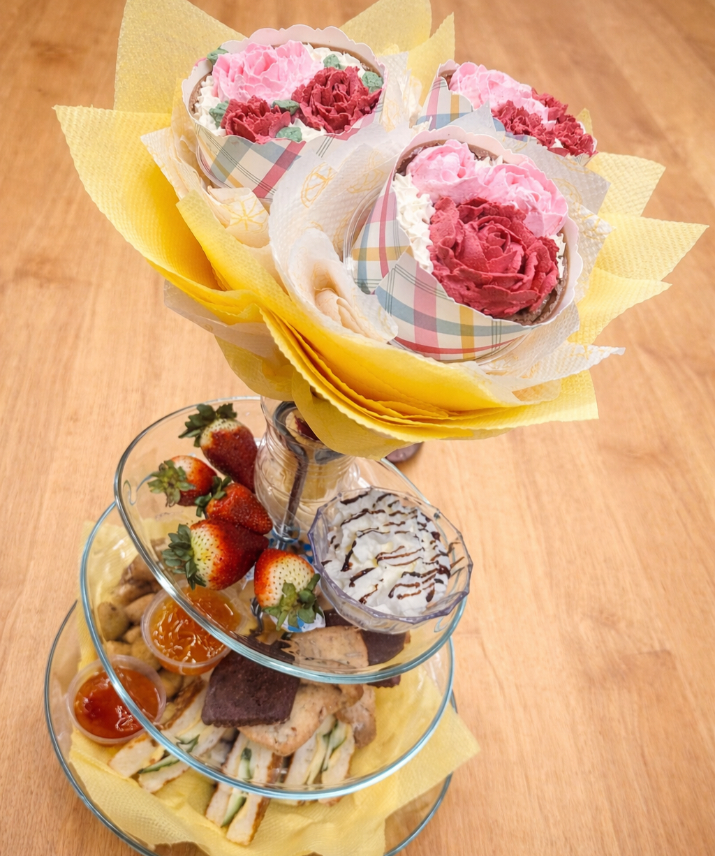 This set features a Secret Florals cheesecake bouquet, paired with hot drinks and comfort bites.